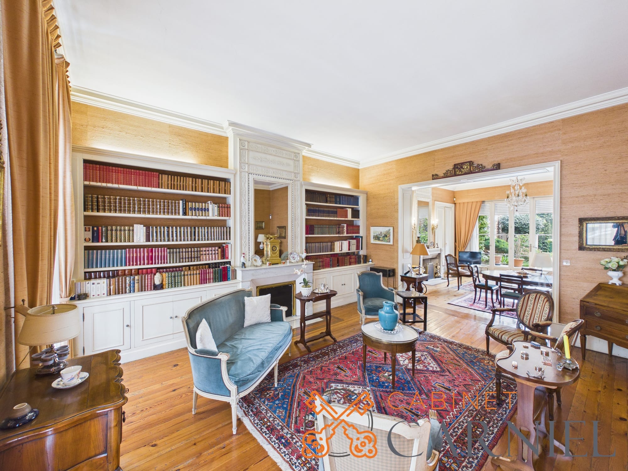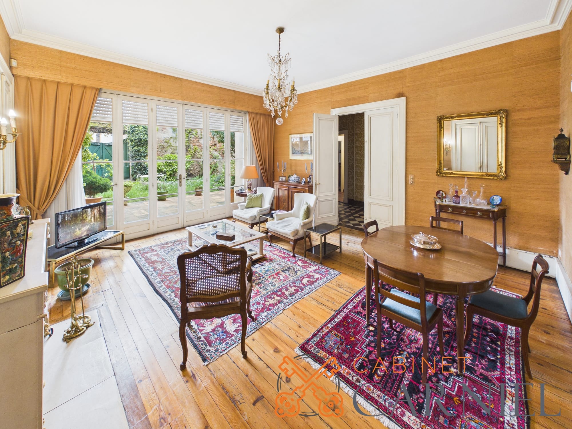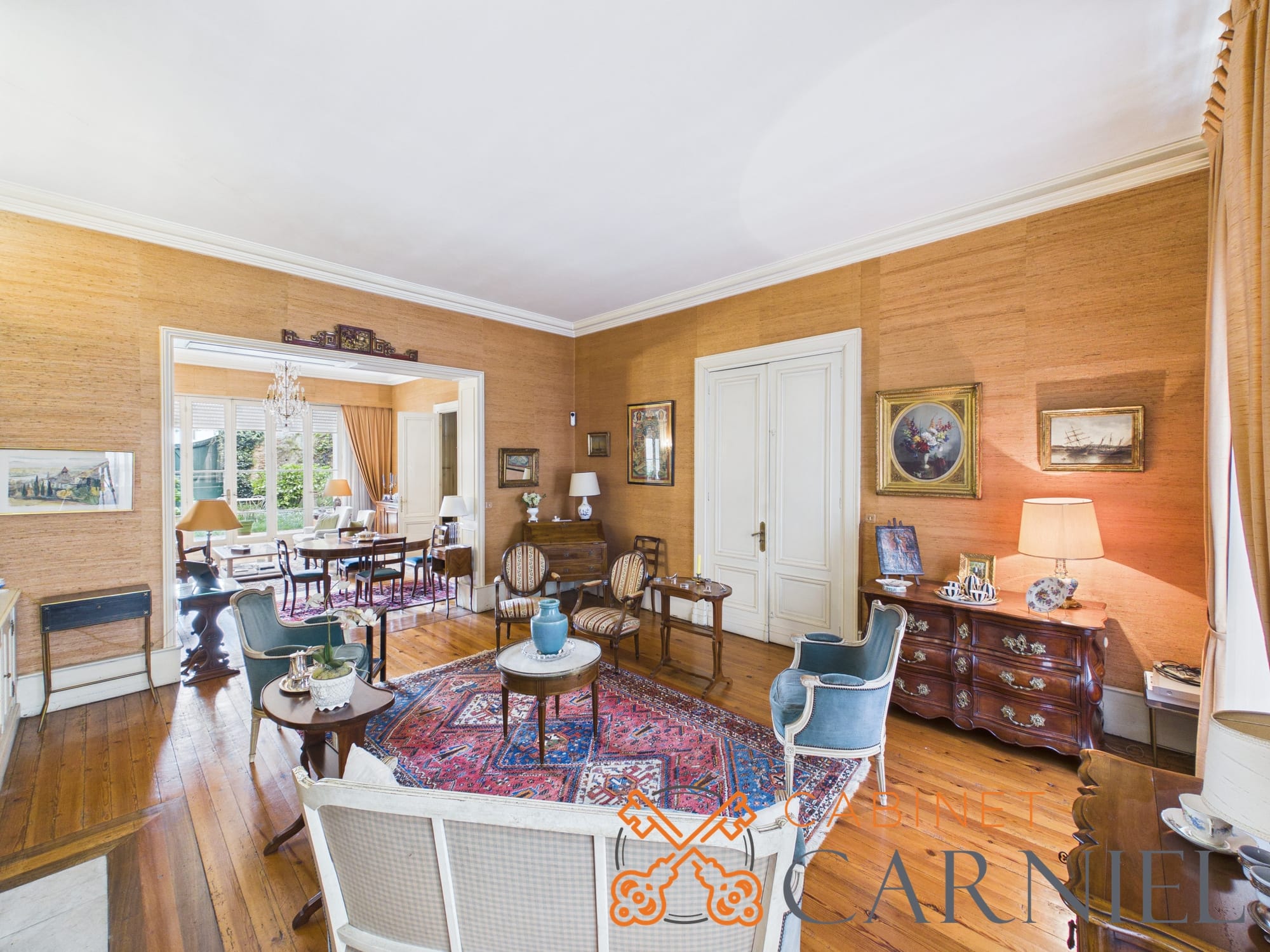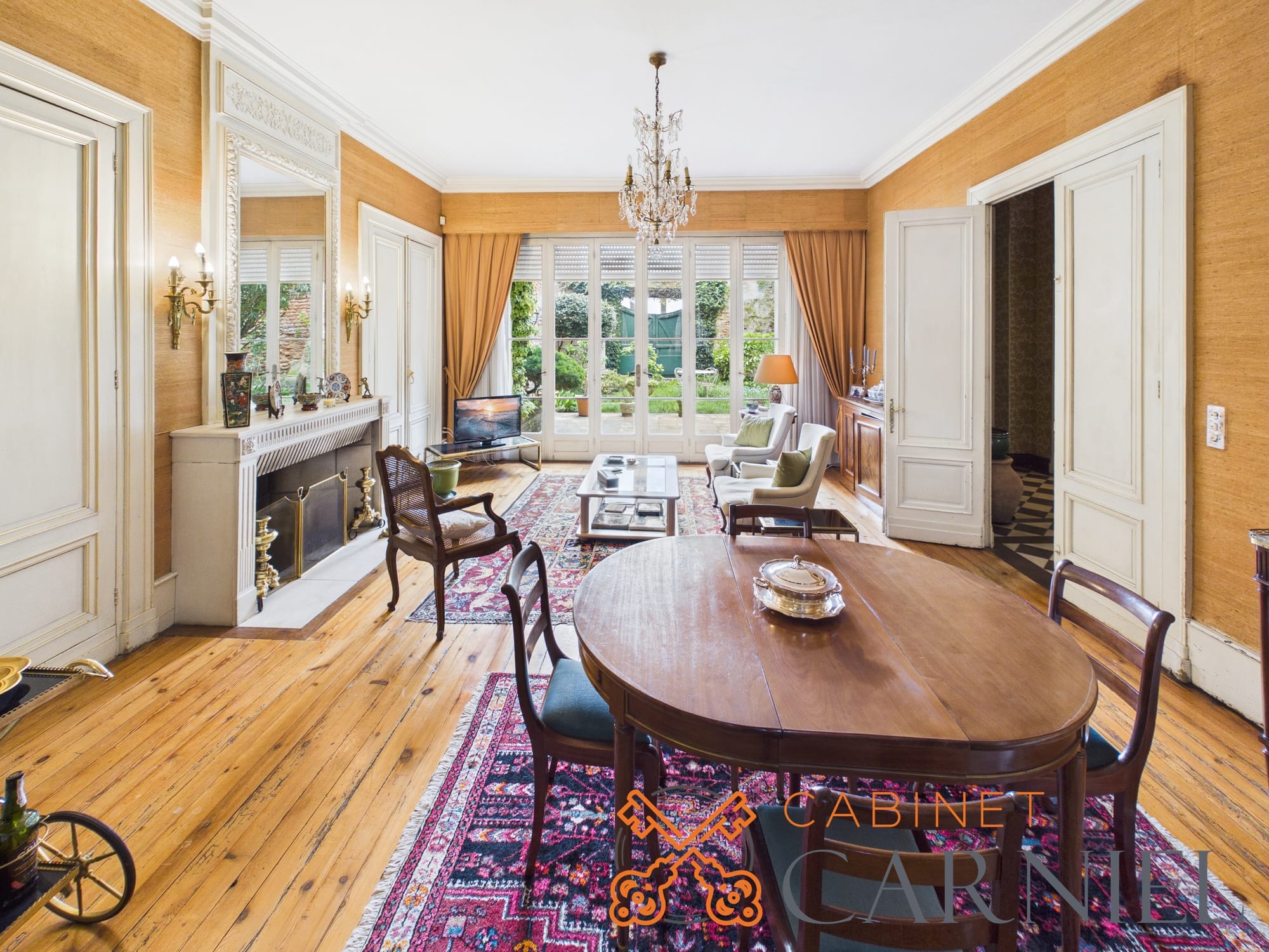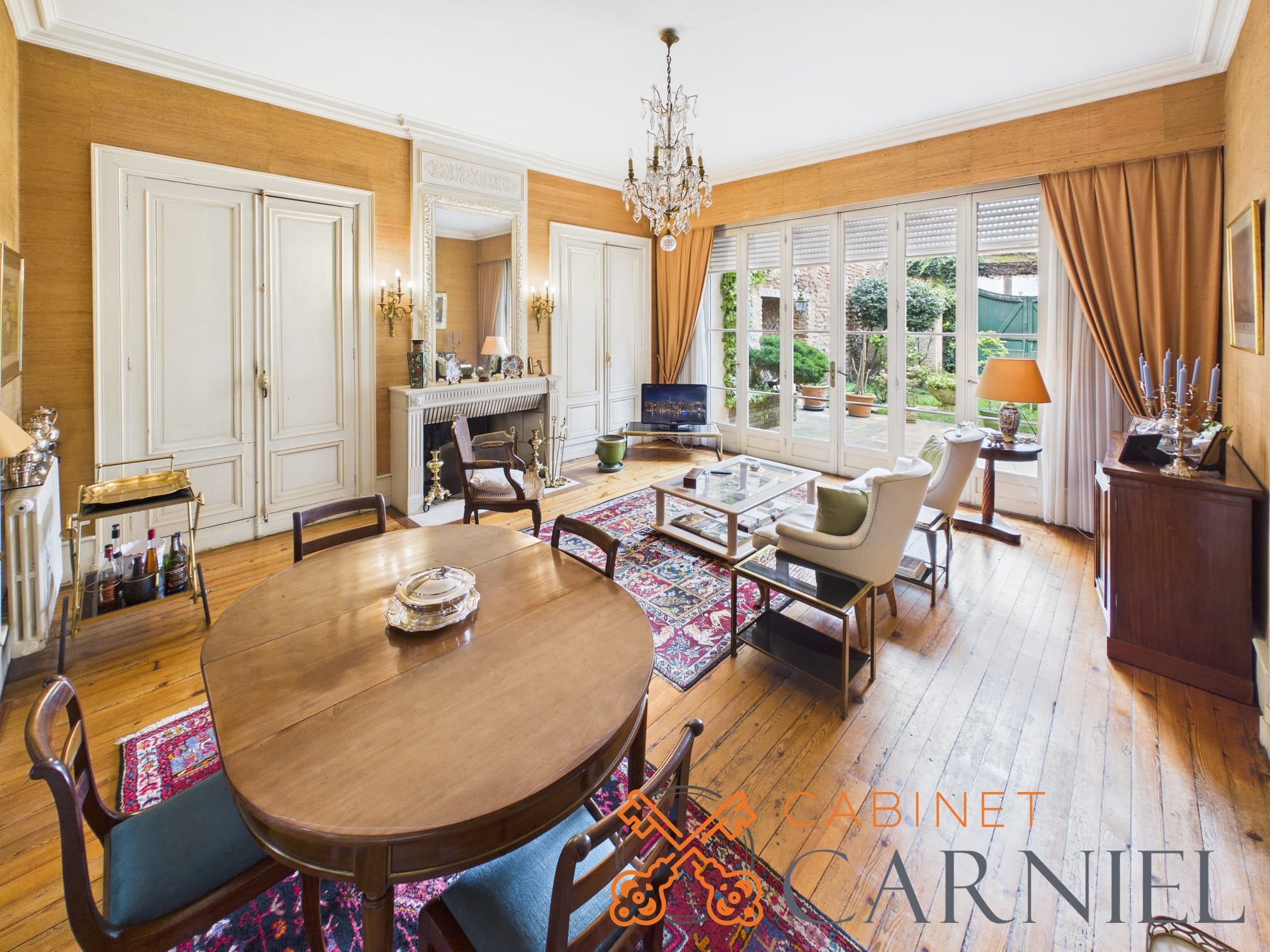 La partie principale s’ouvre sur un vaste séjour lumineux d’environ 58 m2, prolongé par une ouverture directe sur le jardin. Cet espace de réception, aux proportions généreuses, invite à la convivialité. La cuisine séparée, parfaitement agencée, bénéficie elle aussi d’un accès extérieur, facilitant la vie quotidienne comme les moments de réception.