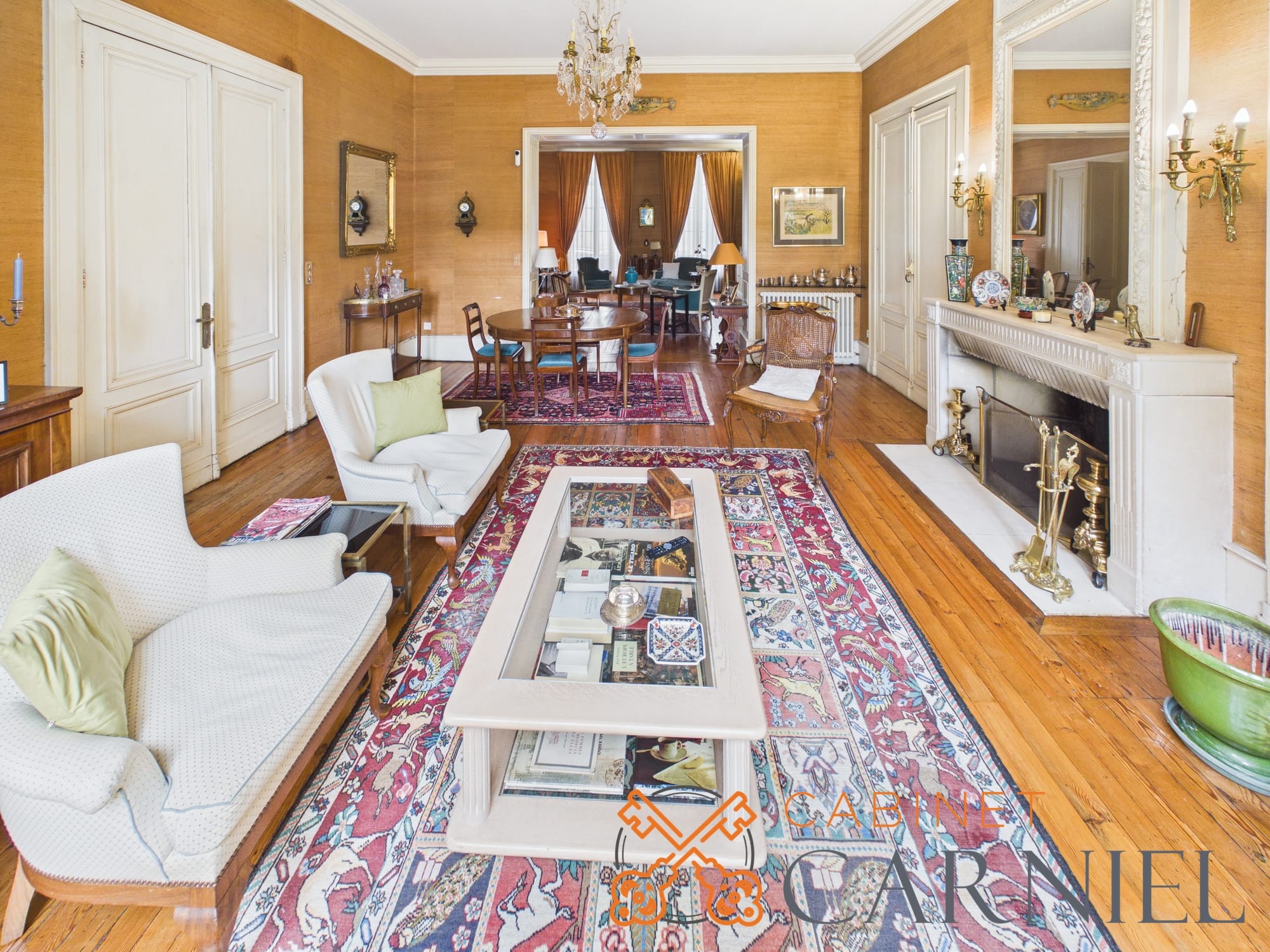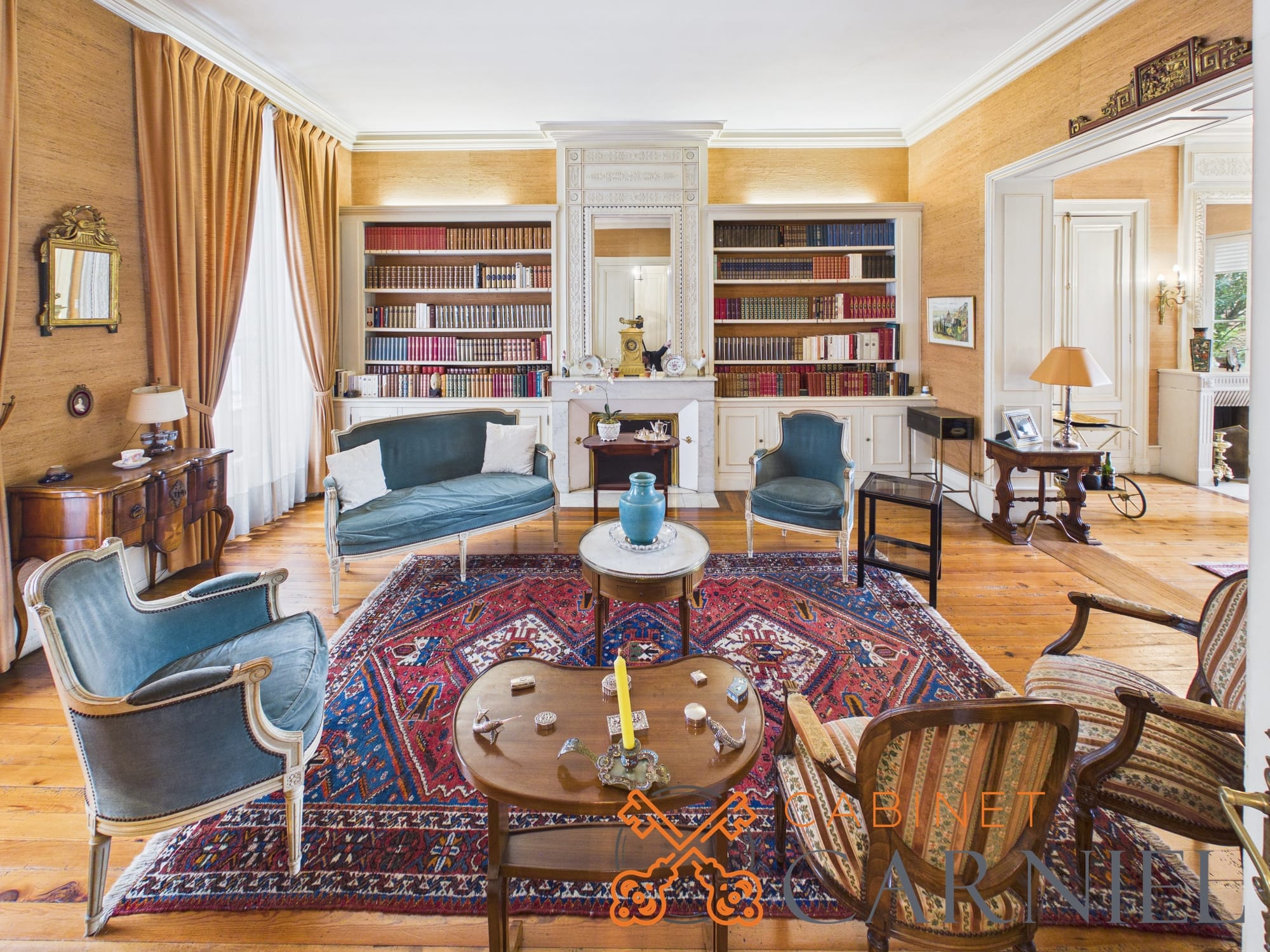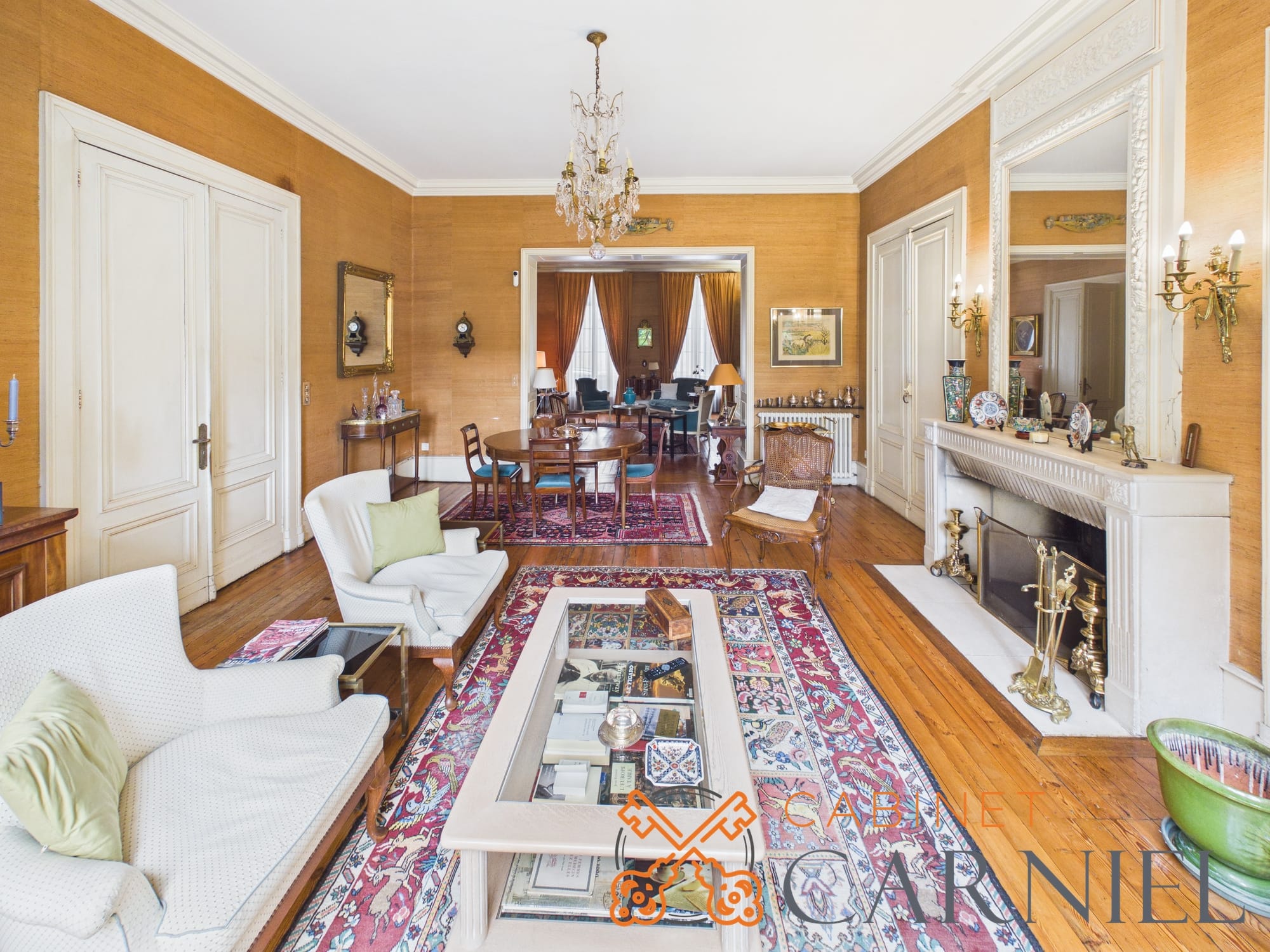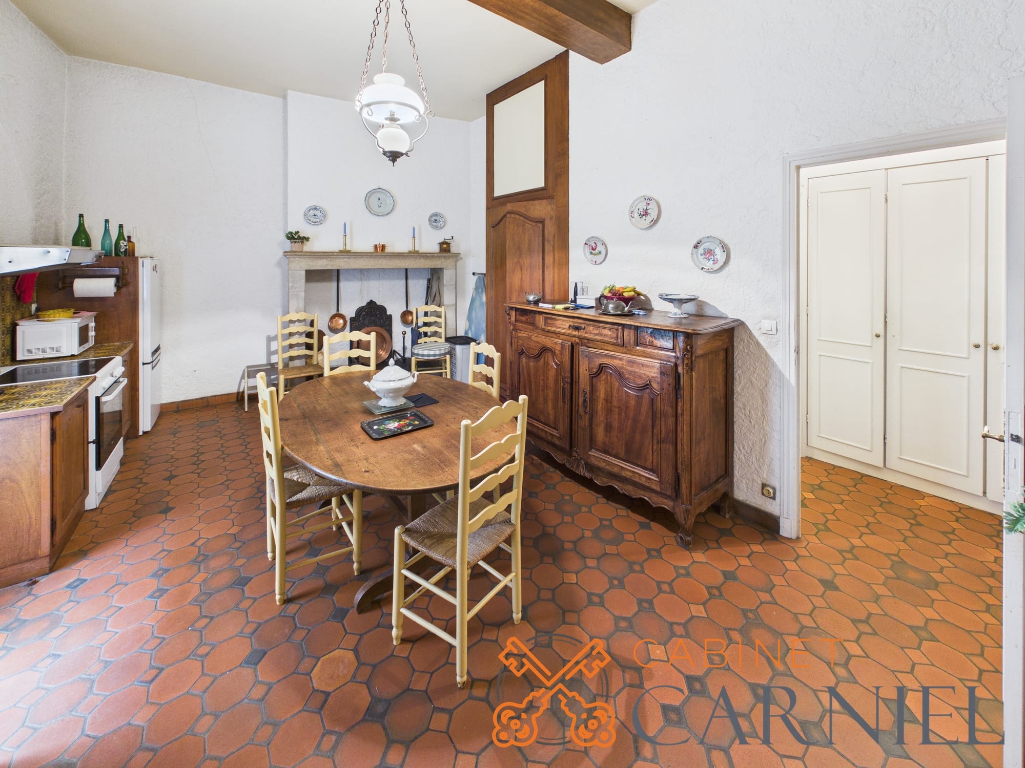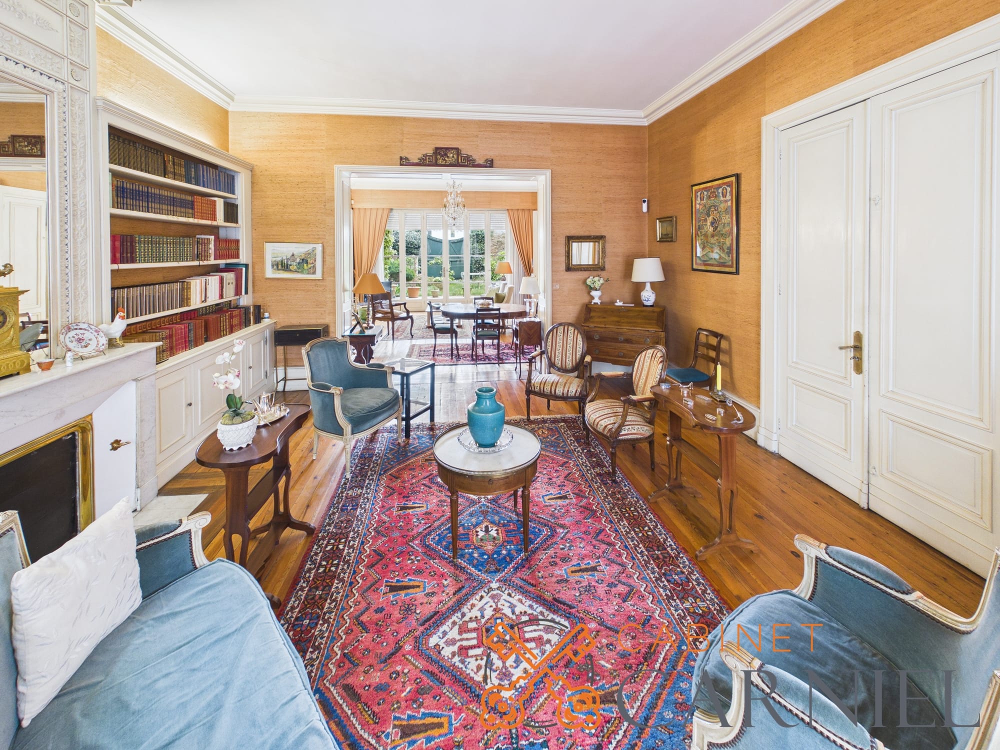 La partie principale s’ouvre sur un vaste séjour lumineux d’environ 58 m2, prolongé par une ouverture directe sur le jardin. Cet espace de réception, aux proportions généreuses, invite à la convivialité. La cuisine séparée, parfaitement agencée, bénéficie elle aussi d’un accès extérieur, facilitant la vie quotidienne comme les moments de réception.