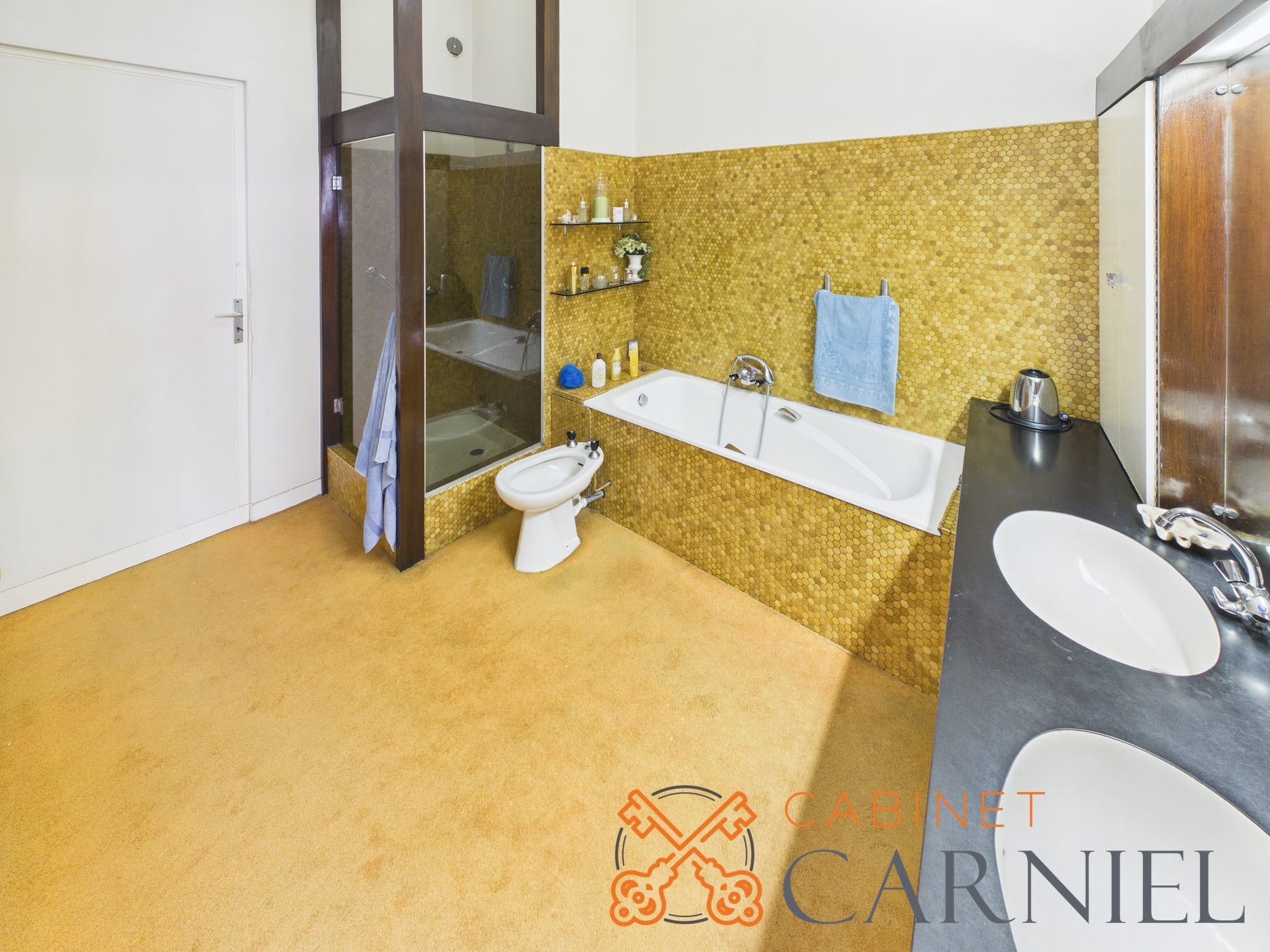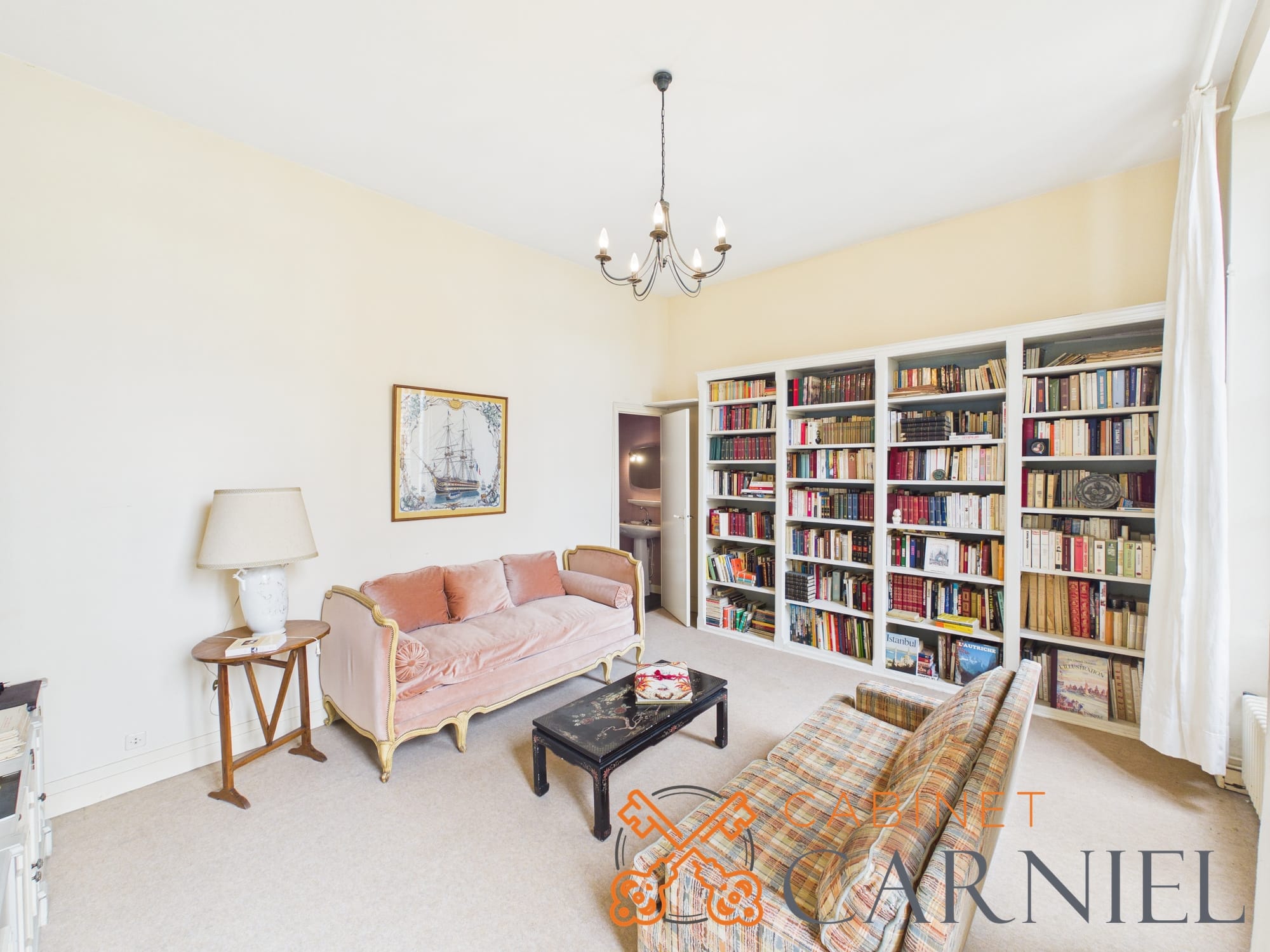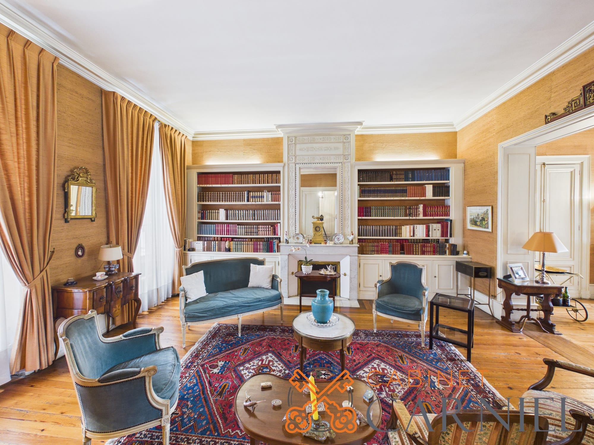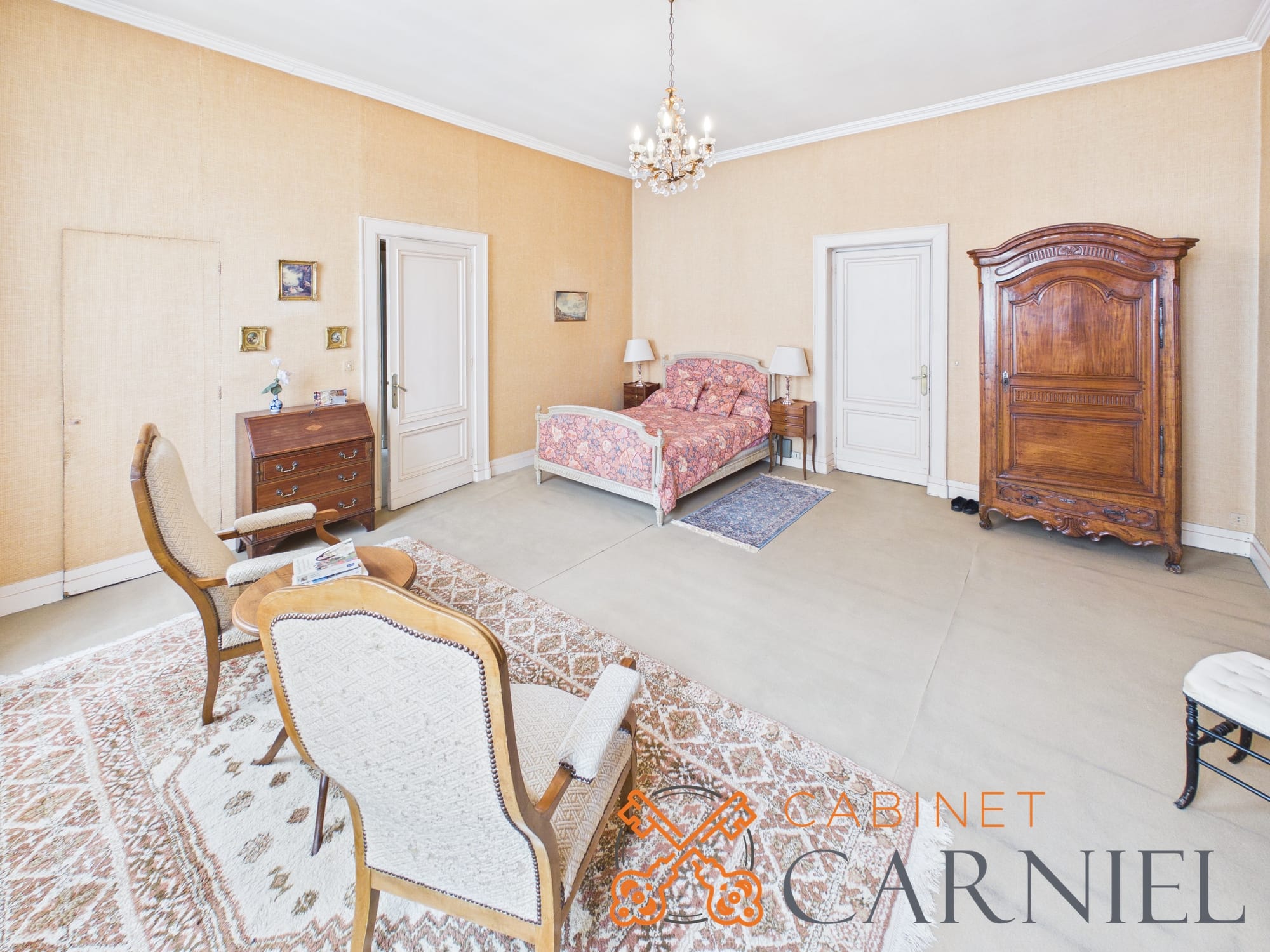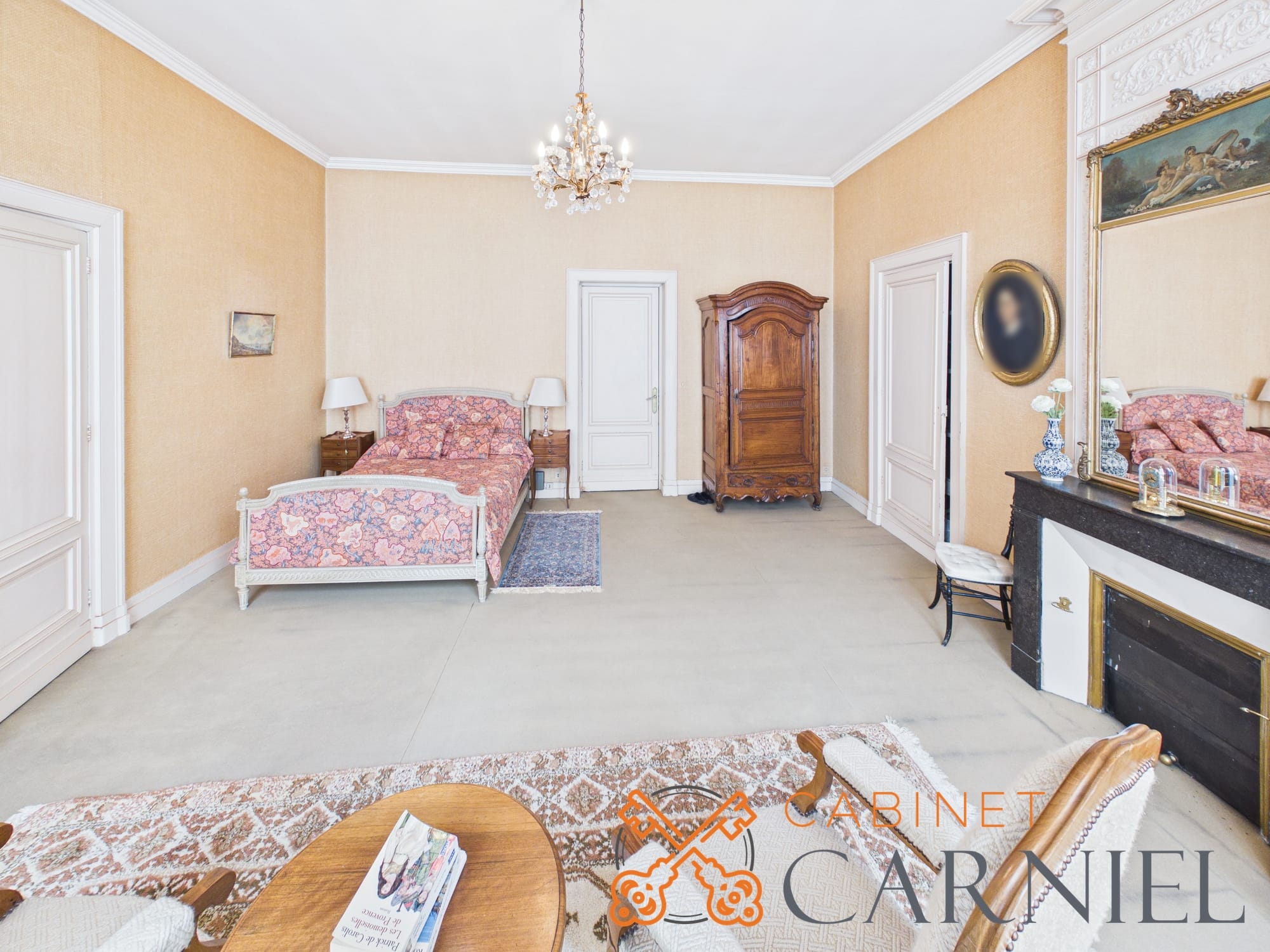 La partie principale s’ouvre sur un vaste séjour lumineux d’environ 58 m2, prolongé par une ouverture directe sur le jardin. Cet espace de réception, aux proportions généreuses, invite à la convivialité. La cuisine séparée, parfaitement agencée, bénéficie elle aussi d’un accès extérieur, facilitant la vie quotidienne comme les moments de réception.